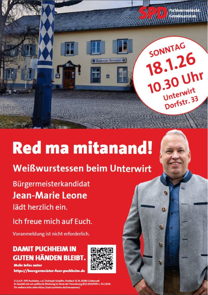 In meiner Gesprächsreihe "Red ma mitanand!" steht als Nächstes ein gemütliches Weißwurstessen im Unterwirt in Puchheim-Ort (Dorfstr. 33) auf dem Programm, zu dem ich alle interessierten Bürgerinnen und Bürger sehr herzlich einlade.