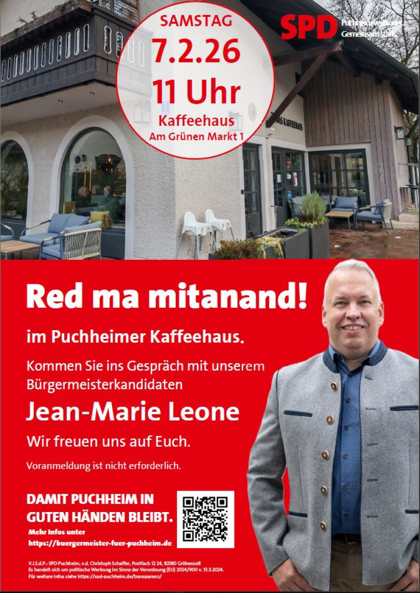 Treffen Sie mich am 7.2.2026 ab 11 Uhr im Kaffeehaus, Am Grünen Markt 1 in Puchheim-Bahnhof und lassen Sie uns ins Gespräch kommen. Über Puchheim, über das, was in der Welt passiert, über mich persönlich und natürlich über die Dinge, die Sie interessieren.